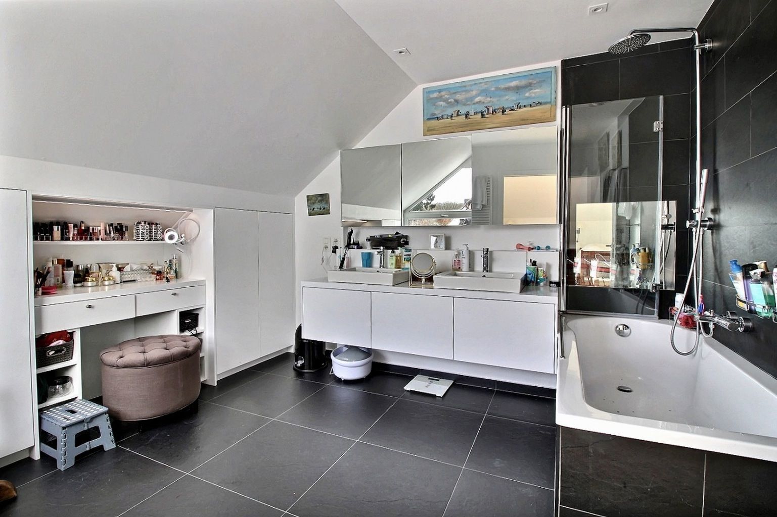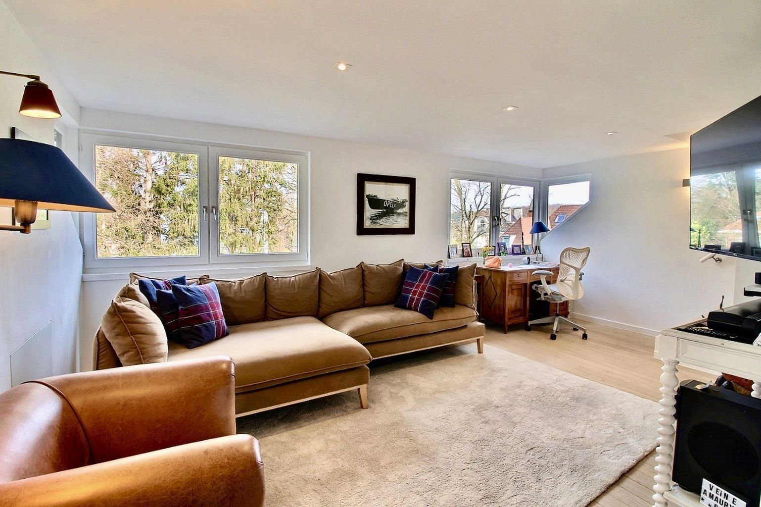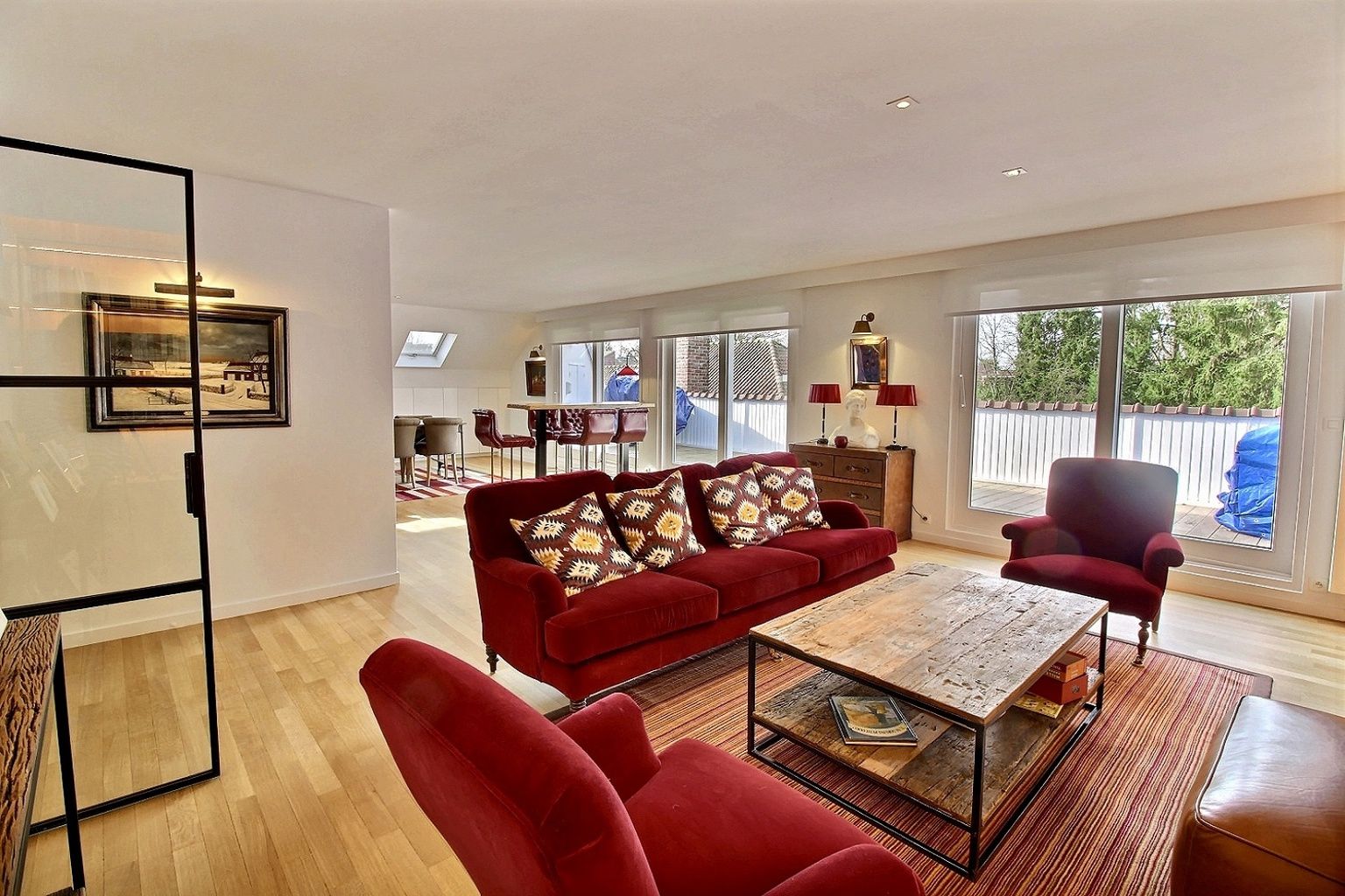 Au coeur du Fort-Jaco, dans une petite copropriété au calme, magnifique appartement penthouse au 2ème et dernier étage entièrement rénové en 2019. L'appartement se compose de vastes réceptions parquetées (+/- 70 m2) menant à une terrasse bien orientée, d'un salon TV, d'un bureau (+/- 25 m2), d'une grande cuisine avec coin à déjeuner (23 m2) et buanderie séparée, de 3 chambres (20, 18, 12 m2), de dressings, de 3 salles d'eau et de 2 greniers. L'appartement dispose également d'un joli jardin privatif de 125 m2 et des terrasses (30 et 10 m2). Chaudière au gaz à condensation, double vitrage, alarme, ascenseur avec accès direct dans l'appartement. L'appartement a été rénové avec goût et détails (air conditionné dans les chambres orientées sud, stores, chauffages d'appoint sur terrasse, nouvelle cabane de jardin, nouvelle toiture isolée 2022) Petite copropriété 1 garage + 1 emplacement de parking (40.000 euros) + 2 caves + parking extérieur pour visiteurs. PEB: D+ Electricité conforme .