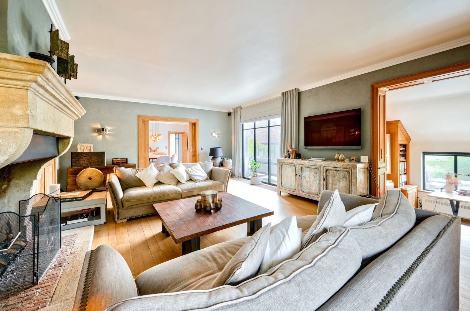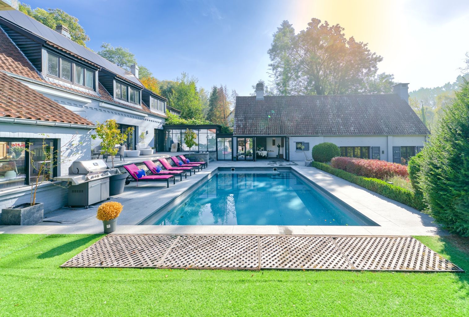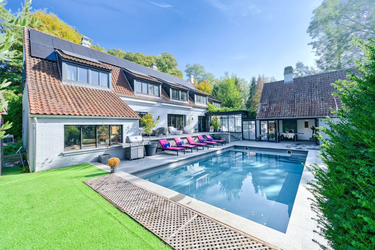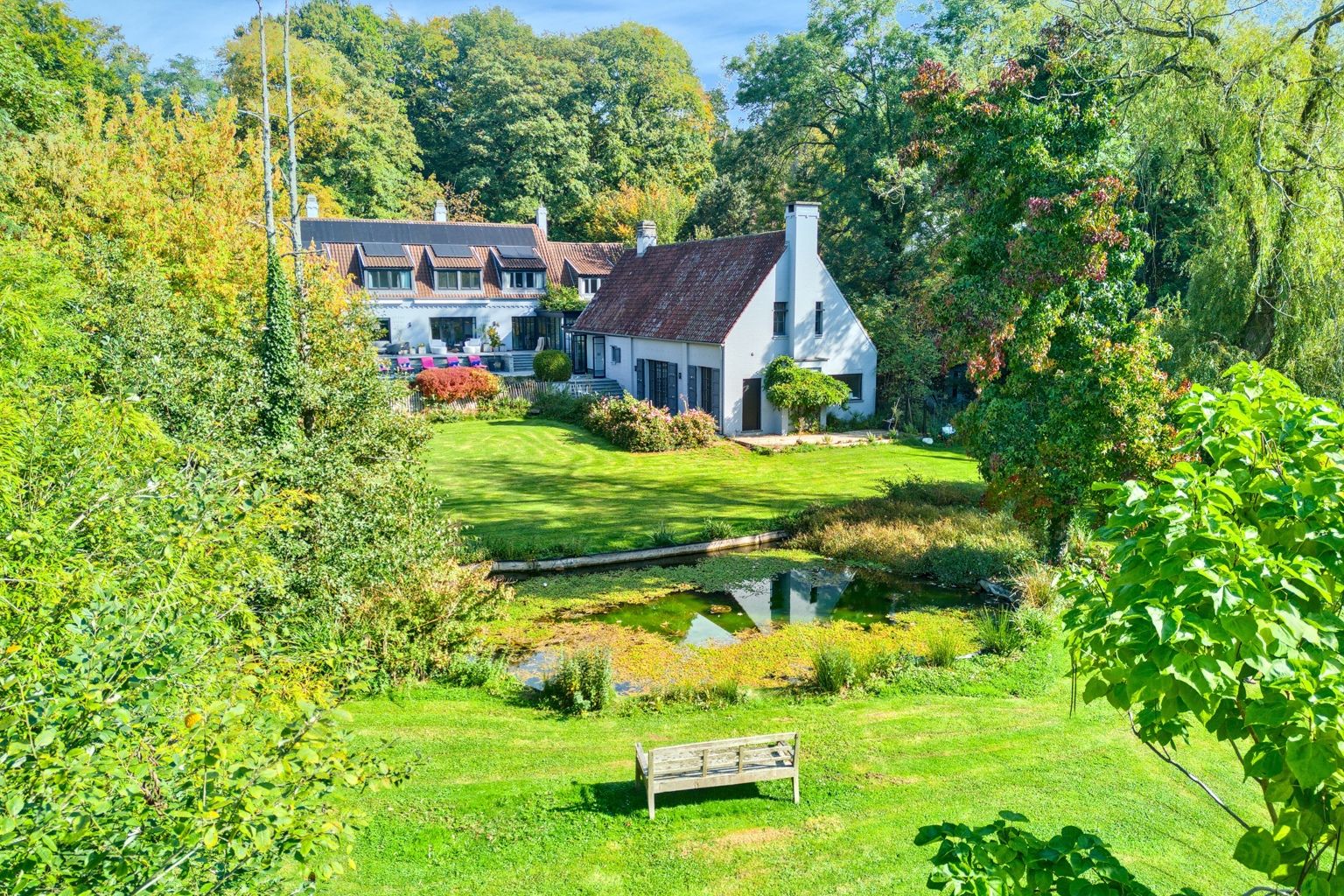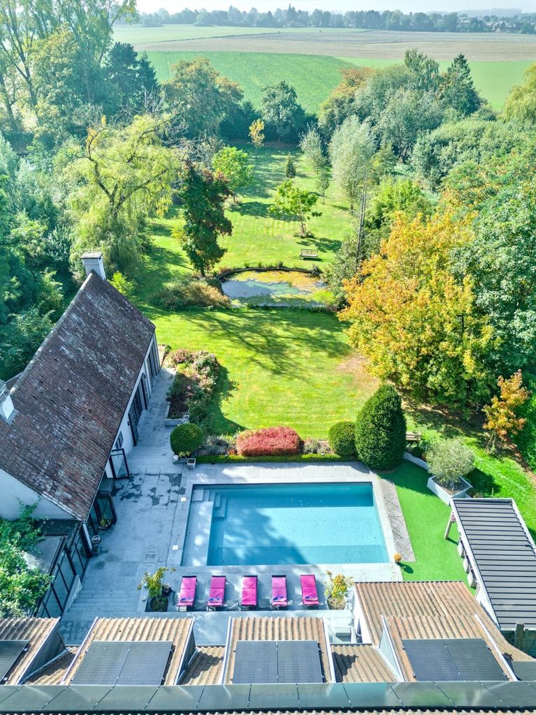 Lillois, dans le quartier recherché du Bois de Mai, non loin des axes routiers, au calme, superbe propriété sise sur un terrain de 66 ares agrémenté d'une piscine, d'un étang, d'un verger, d'un potager et d'une conciergerie. La villa offre de belle réceptions parquetées avec feu ouvert, un espace bureau - bibliothèque, une salle à manger avec ses baies vitrées donnant sur la terrasse, une cuisine super équipée, une buanderie - office, une salle à manger d'été un espace poolhouse: douche, wc, un 2ème séjour avec mezzanine et son entrée indépendante. A l'étage: la chambre des maîtres avec son dressing et sa sdb, 2 autres chambres, 1 sdd, et une double chambre avec sa sdd. Au sous-sol: un cellier et des caves. Une conciergerie séparée avec sa pièce à vivre, sa kitchenette, 1 chambre et 1 sdb. L'extérieur comporte une belle terrasse autour de la piscine, un magnifique parc avec son étang, son verger (pommiers, poiriers,...) et son potager. 24 panneaux solaires, une double borne extérieure, chaudière gaz à condensation, adoucisseur d'eau. PEB C avant installation des panneaux solaires. Vous serez séduit par les divers espaces et l'atmosphère chaleureuse qu'offre la villa et par son magnifique parc joliment arboré orienté Sud..
